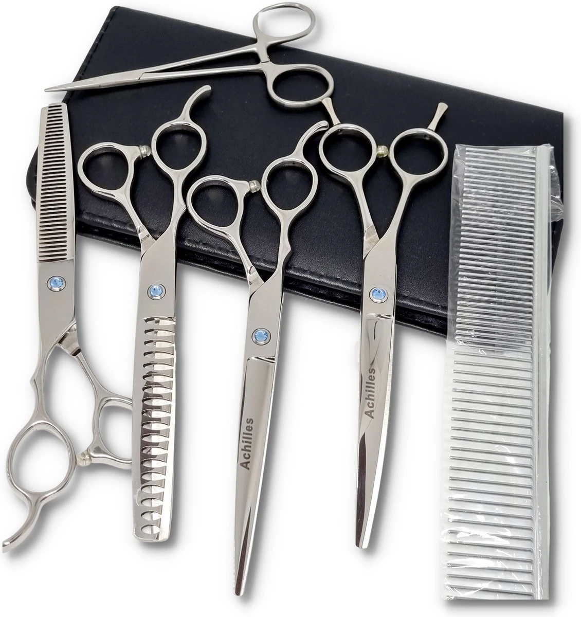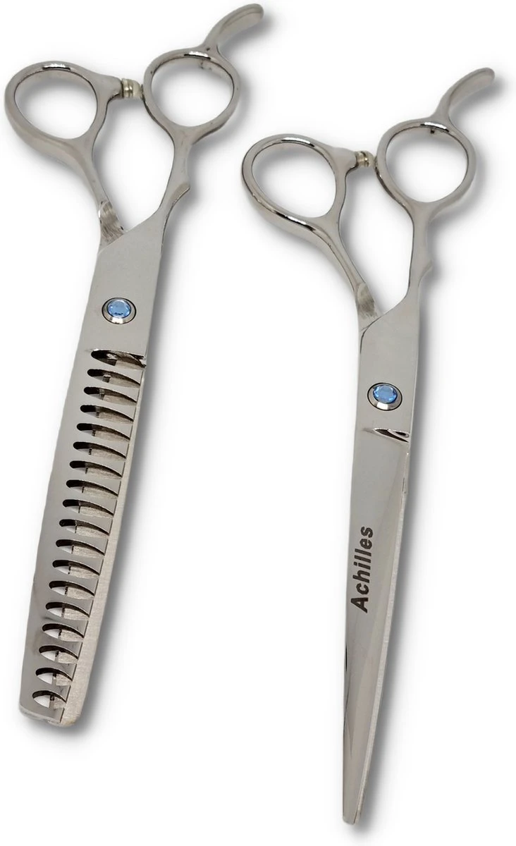 Achilles Professionele (Linkshandig) scharenset voor honden. Zijn de haren van uw hond te lang? Wil je je huisdier zelf verzorgen? Dan is de 7-delige scharenset van Achilles de juiste voor u.
