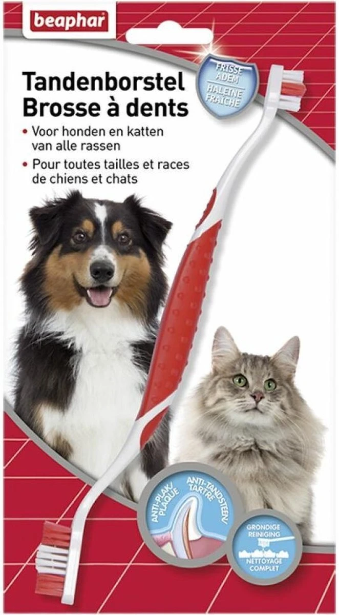 Dagelijks poetsen gaat tandplak en de vorming van tandsteen tegen en zorgt daarnaast voor een frisse adem. De dubbele tandenborstel is geschikt voor alle honden en katten. Het rubberen handvat zorgt voor extra grip. De borstelharen zijn zacht en flexibel om het tandvlees te beschermen, ze zijn verschillend van lengte om alle plaatsen in de bek goed te bereiken.