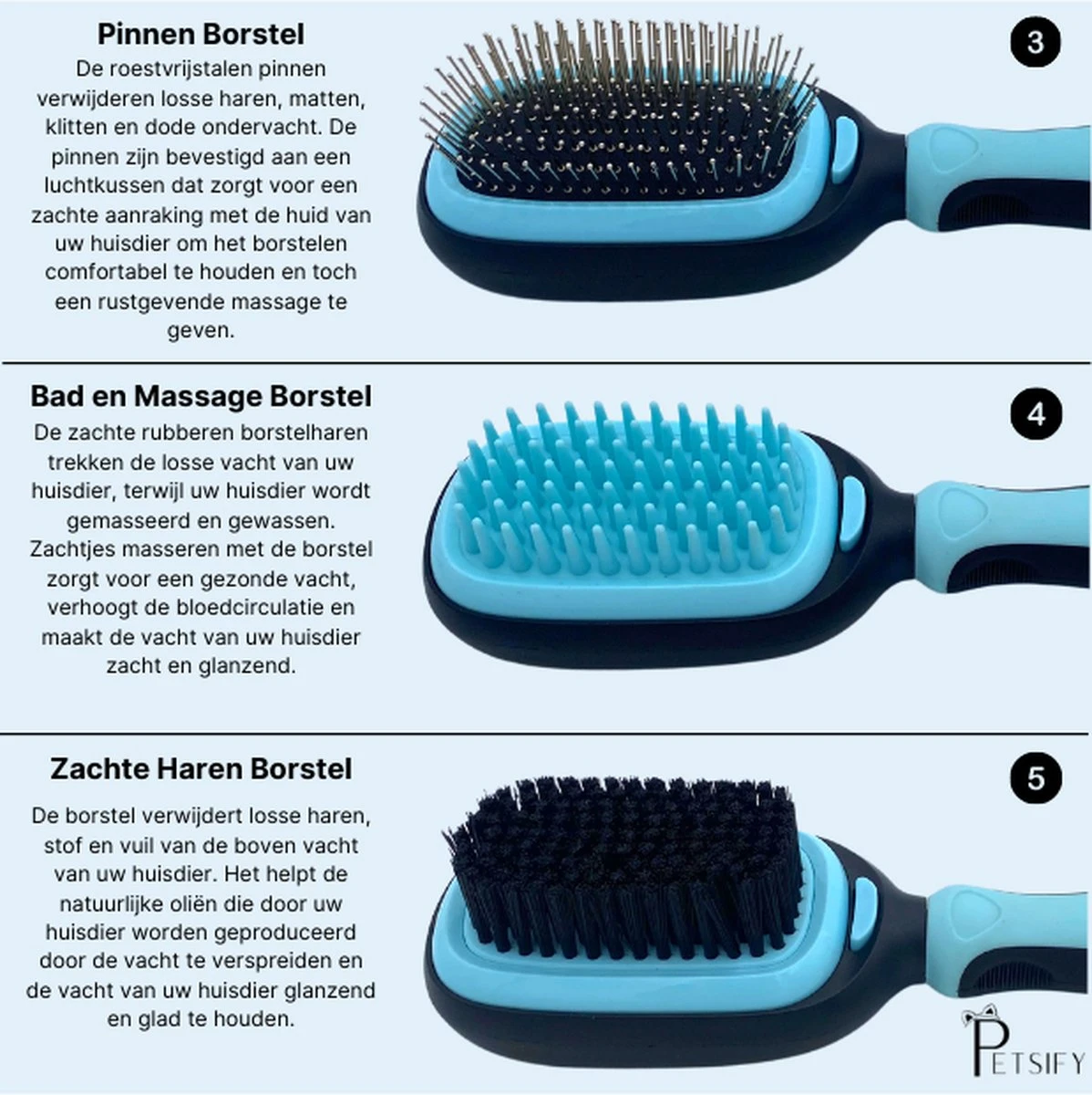 Bent u op zoek naar complete dierenborstel om uw viervoeter optimaal te verzorgen? Zoek dan niet verder. De Petsify 5-in-1 dierenborstel beschikt over 5 unieke borstels en kammen om uw dier compleet te verzorgen. Zo houdt u de vacht en uw huisdier gezond!